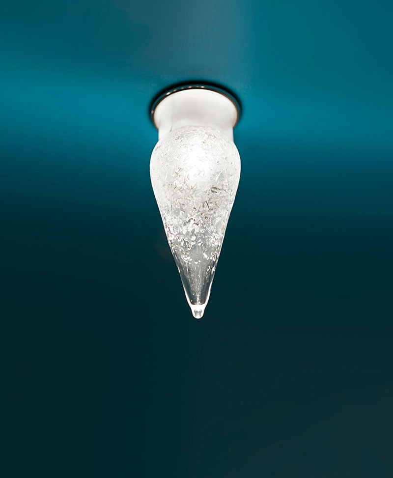 Lampada a luce diretta prevista per l’applicazione ad incasso. La lampadina è a bassissima tensione. La coppa è in vetro borosilicato soffiato e formato a mano, con finitura artigianale che riproduce l’effetto del ghiaccio. Ogni ghiacciolo è, come in natura, diverso per forma e dimensione.