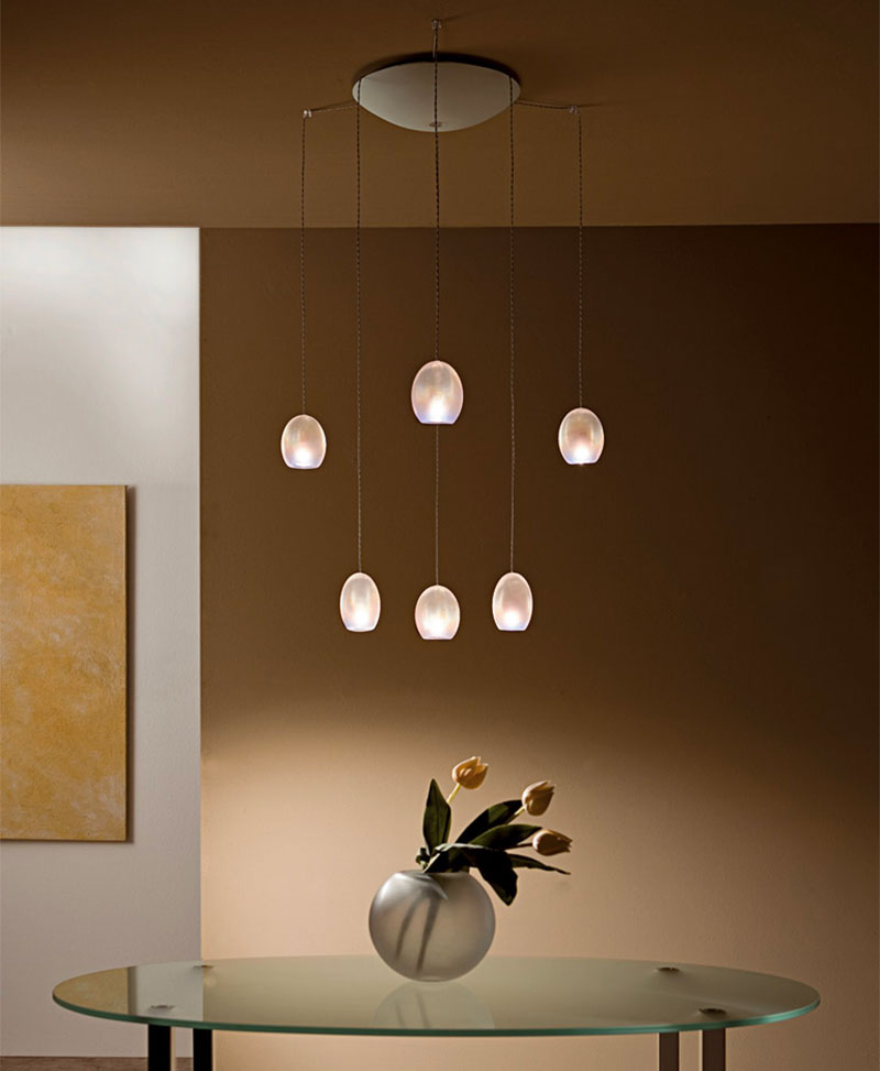 Lampadari con corpi illuminanti alimentati a bassissima tensione, disponibili in varie dimensioni. Dal rosone centrale, che contiene il trasformatore, si possono sospendere da 1 a 18 corpi illuminanti con cavo di alimentazione a treccina. Il rosone è disponibile in acciaio specchiato o bianco. I corpi illuminanti sono a scelta tra quelli della collezione a 12V.