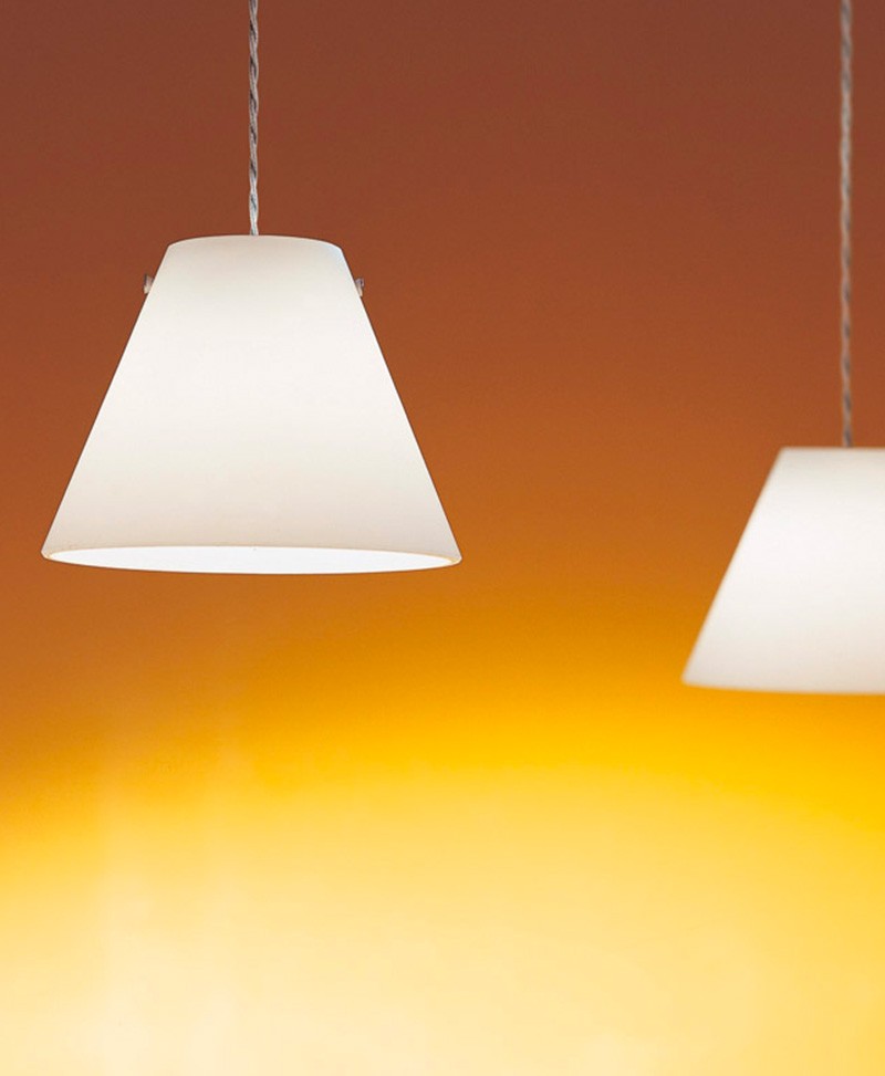 Pendilla fornisce luce diretta schermata lateralmente per mezzo del diffusore in vetro soffiato a tre strati, realizzato in modo artigianale. La lampadina è alogena bispina. Disponibile in vari colori. E’ dotata di cavetto a piattina separabile. E’ un elemento illuminante predisposto per i Sistemi Orbite e Radiale. E’ utilizzabile con lampadine a LED.