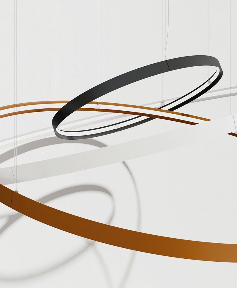 Apparecchio a sospensione a luce diffusa con sorgente SMD lineare alimentata in corrente continua a tensione costante attraverso driver all’interno di rosone da ordinarsi separatamente. È possibile installare in remoto il driver di alimentazione senza necessariamente acquistare l’accessorio rosone. Le sorgenti sono installate su un profilo in alluminio estruso e calandrato. L’apparecchio completo è composto da settori connessi tra di loro tramite dei giunti di alluminio pressofuso, che assolvono anche il compito di sedi per il fissaggio dei cavi di sospensione d’acciaio dell’apparecchio. La continuità elettrica avviene tramite morsettiere ad attacco rapido, nascoste da dei tappi in tecnopolimero stampato. Difusore in PC opale rigato, corpo apparecchio in lega di alluminio estrusa 6060. Regolazione micrometrica dell’altezza. Verniciatura a polveri epossidiche per nero txt e bianco txt, a liqudo per le altre finiture. Prodotto installabile in obliquo.