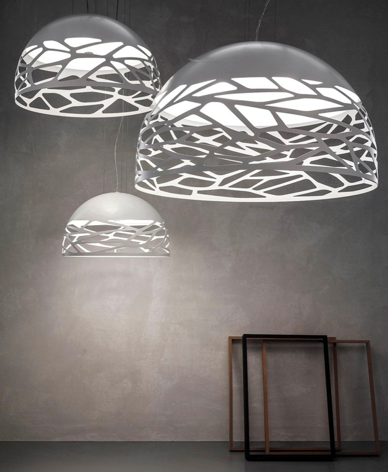 Forme geometriche decise e insieme leggere, caratterizzate da particolari tagli a laser che danno vita ad un dinamico gioco di luci e ombre. Realizzate in metallo, con il loro preciso segno grafico le lampade Kelly a sospensione e a parete affascinano anche da spente, diventando oggetti di arredo che personalizzano l’ambiente.