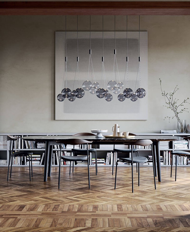Disegnata da Chia-Ying Lee, Random evoca un gruppo di bolle che danzano giocosamente nel vento. Random traduce l’evanescenza della bolla in un vetro soffiato perfetto nella regolarità della sua superficie e resistente agli sbalzi termici. Fini cavi metallici sorreggono le tre sfere dal diametro di 18, 14 e 12 cm. Un sottile cilindro di metallo, contenente il driver, accoglie i cavi delle singole sfere e crea un grappolo di luci.Sospesa al cavo di alimentazione, Random diffonde una luce calda e diffusa con temperatura di colore più calda (2700 K) o più fredda (3000 K) emessa da tre LED da 1 W, uno per ognuna delle tre sfere di vetro soffiato. La sorgente a LED è posizionata in un alloggiamento in silicone nella parte superiore della lampada. L’indice di resa cromatica (CRI) pari a 90 restituisce fedelmente il colore naturale degli oggetti.