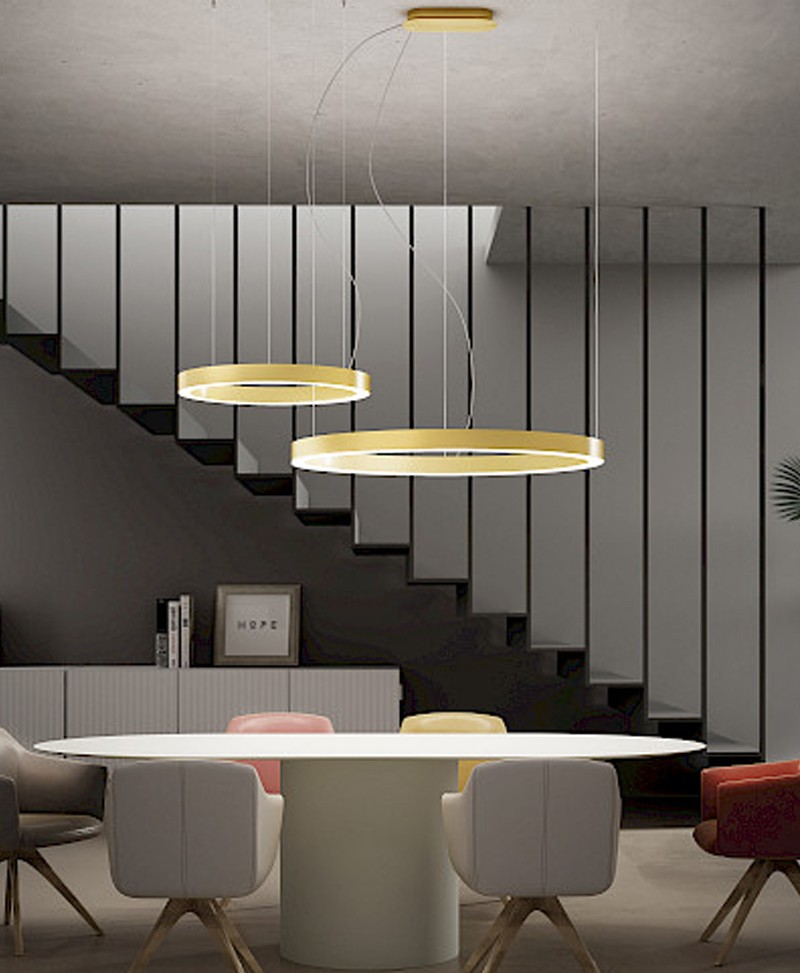 Anello luminoso sospeso con emissione diretta ed indiretta, struttura compatta e leggera h. 5,5cm.