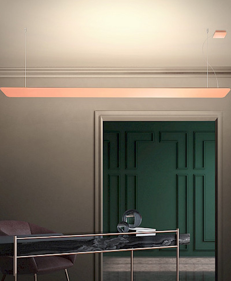 Lampada a sospensione lineare ad emissione luminosa diffusa totalmente indiretta.
