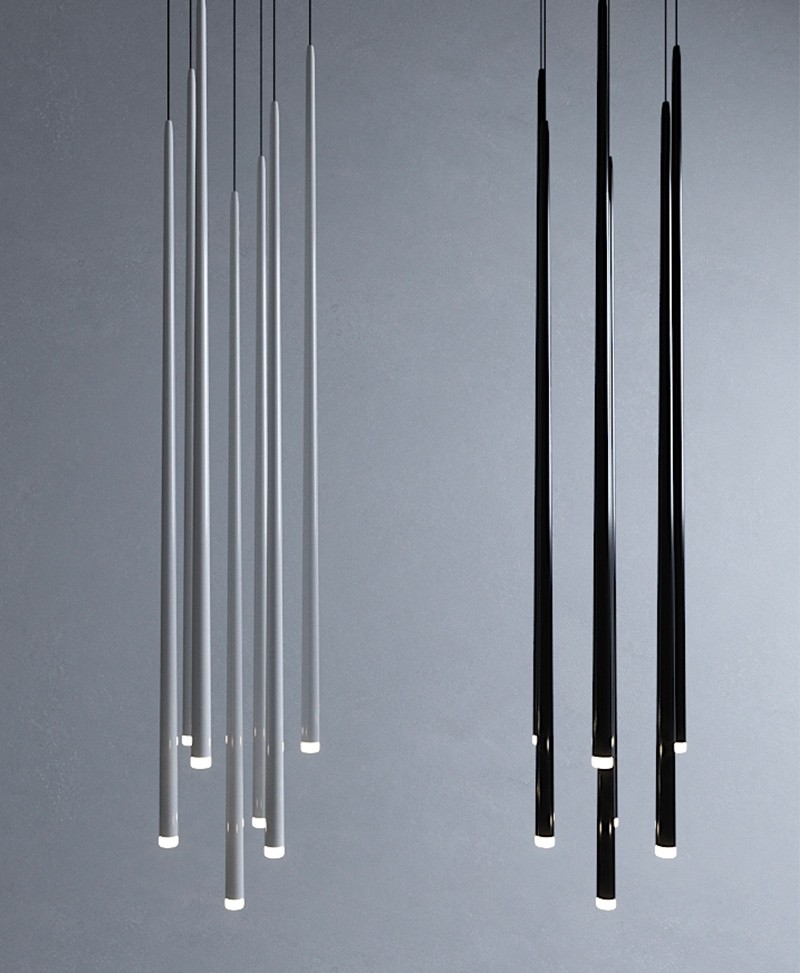 La lampada a sospensione Slim di Vibia è realizzata in diverse versioni: singola oppure a 4, 6, 7, 10, 13 e 22 coni per adattarsi all’uso privato e pubblico. Tutti i modelli della collezione Slim sono disponibili in due colori: fibra laccata bianca e fibra in carbonio nera, ed è personalizzabile anche nel colore che l’utente preferisce.